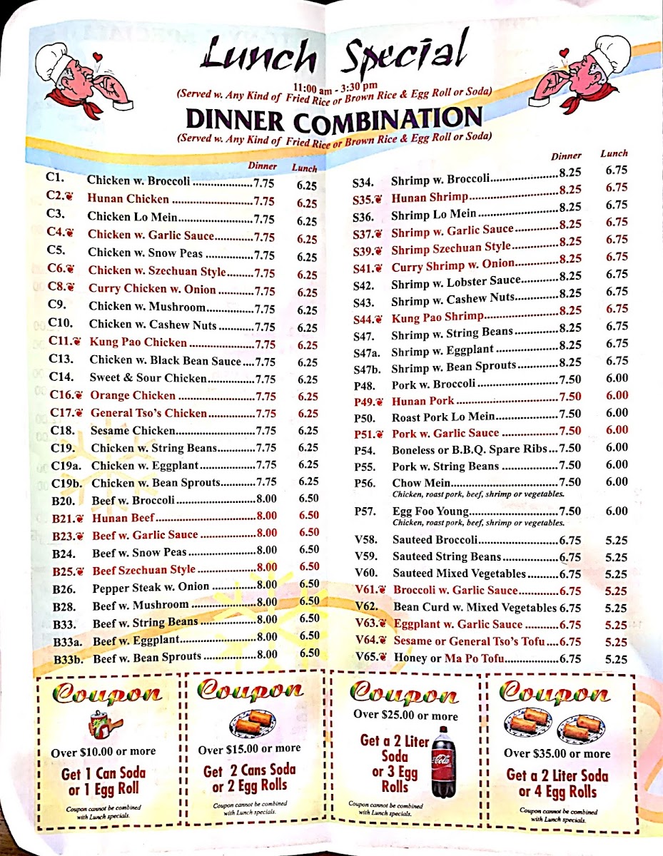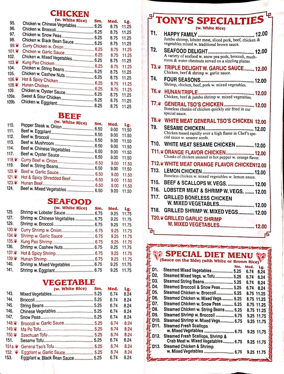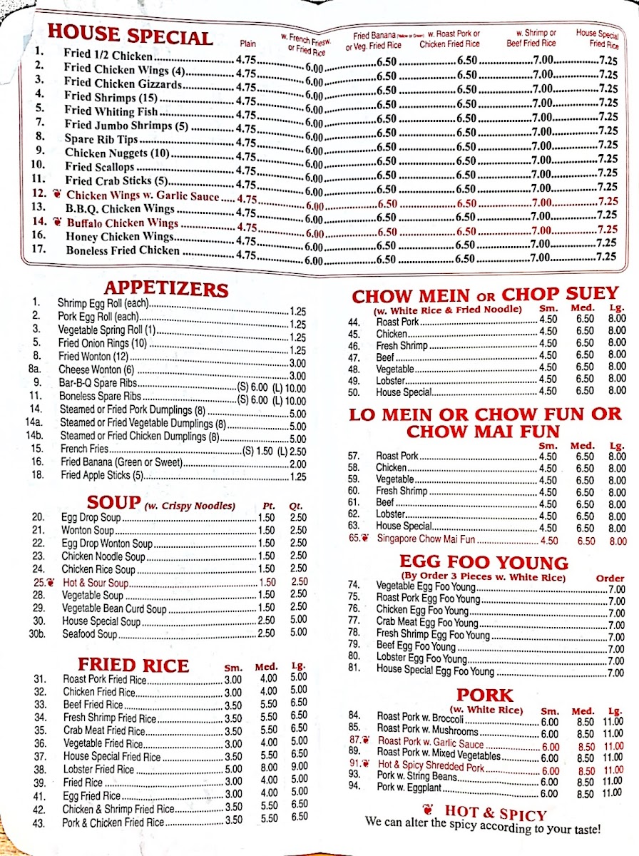 From a reviewer’s perspective, the menu at Old Peking on Montgomery Street is a dive into classic, affordable Chinese comfort food with a long list of approachable options. The appetizers set the tone with crowd‑pleasers like Shrimp Egg Roll ($1.10), Vegetable Spring Roll ($2.50 for 2), and Fried Wonton ($2.45 for 12 pieces) alongside simple snacks like Fried Onion Rings ($1.00 for 10 pieces) and Shrimp Toast ($2.00), offering quick bites before the main courses. Beyond starters, the menu expands into hearty soups, fried rice, and noodle dishes, all reasonably priced and hearty. Signature mains include classic fried rice and chow mein variations, comforting egg foo young plates, and an array of chicken, beef, pork, and seafood entrées that cater to both traditional tastes and those seeking familiar American‑Chinese flavors. The sheer variety - from Vegetable Dumpling ($4.50) to Boneless Spare Ribs ($5.00+) - reflects the restaurant’s aim to serve generous portions without breaking the bank, making it a go‑to spot for satisfying, budget‑friendly meals.